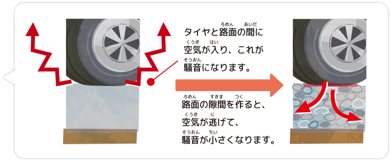 車の騒音を減らしたり、歩道を歩きやすくするため雨水を地下に通したりする舗装を行っています。また、雨の日などに溜めた水を晴れた日に蒸発させることで路面(道路の表面)の温度を下げ、夏の暑い日でも涼しく歩ける工夫をした舗装も行っています。